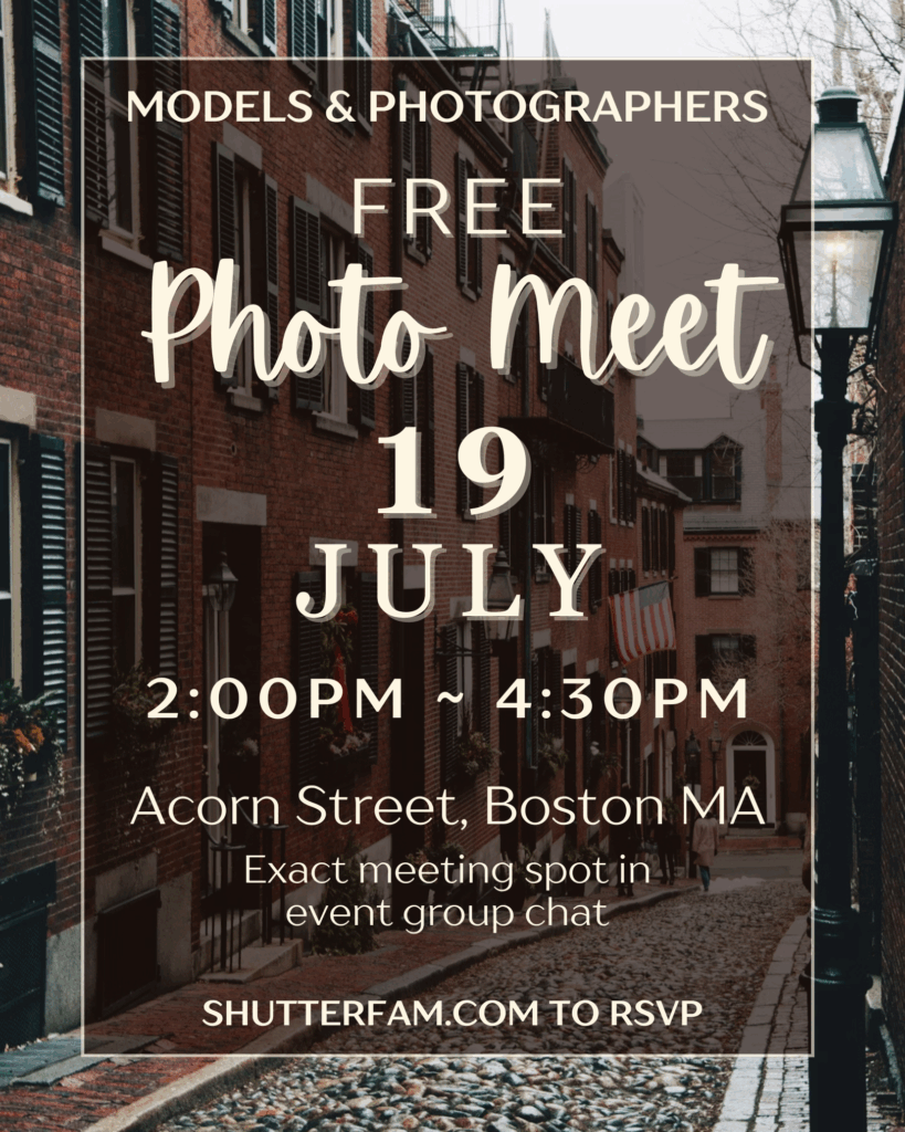 We’re hosting a pop-up photo meet on one of Boston’s most iconic cobblestone streets — Acorn Street! Come shoot, connect, and create with other local photographers and models.