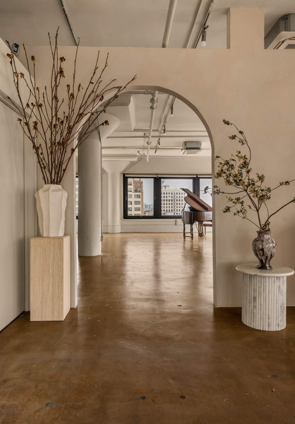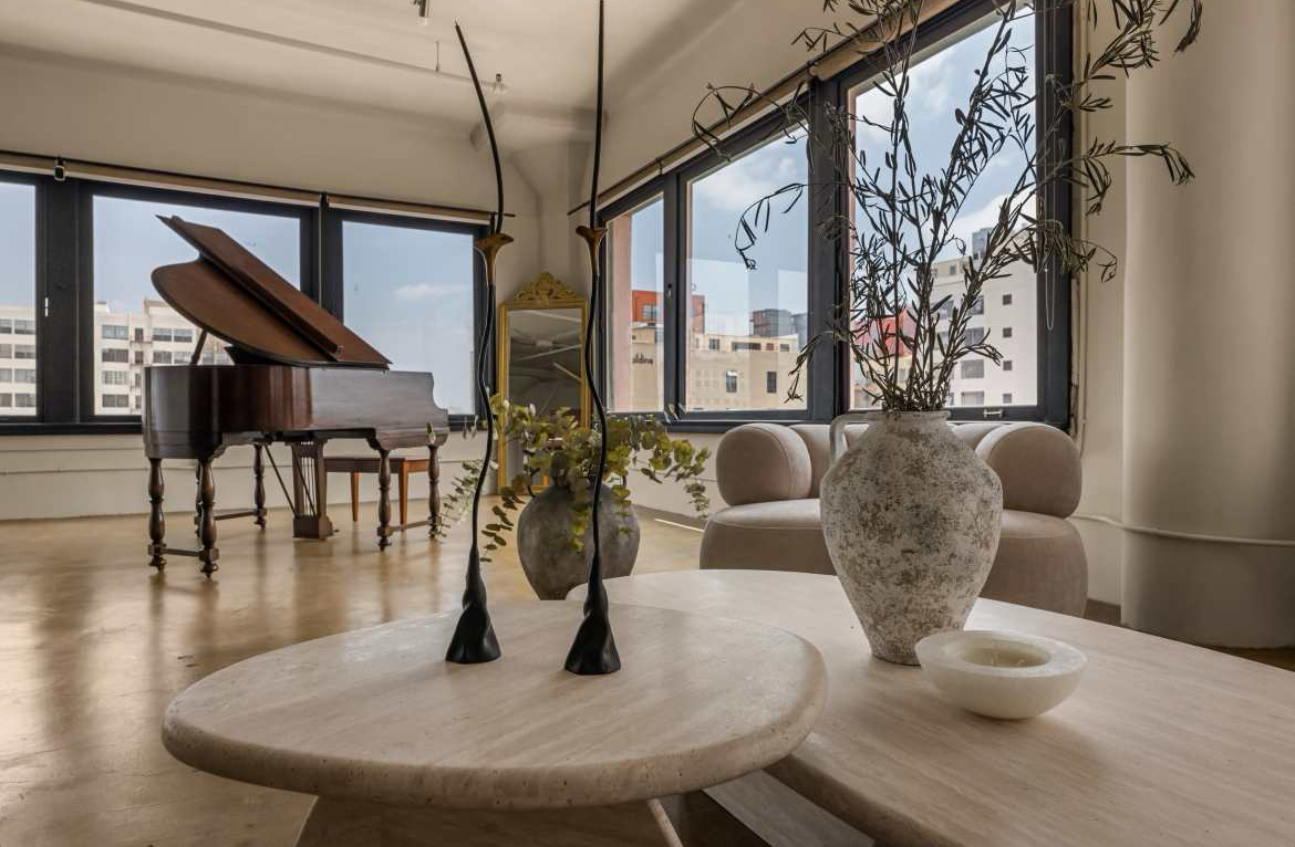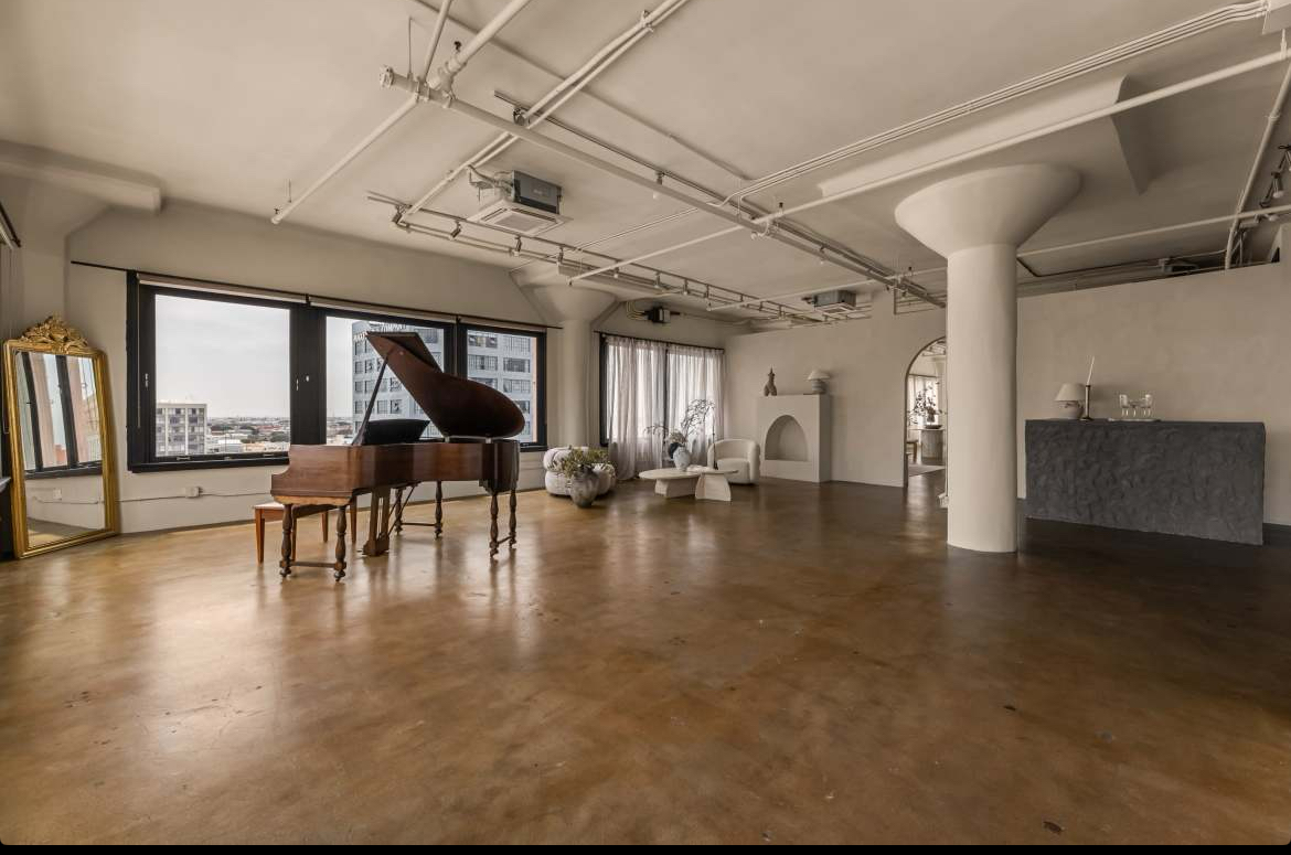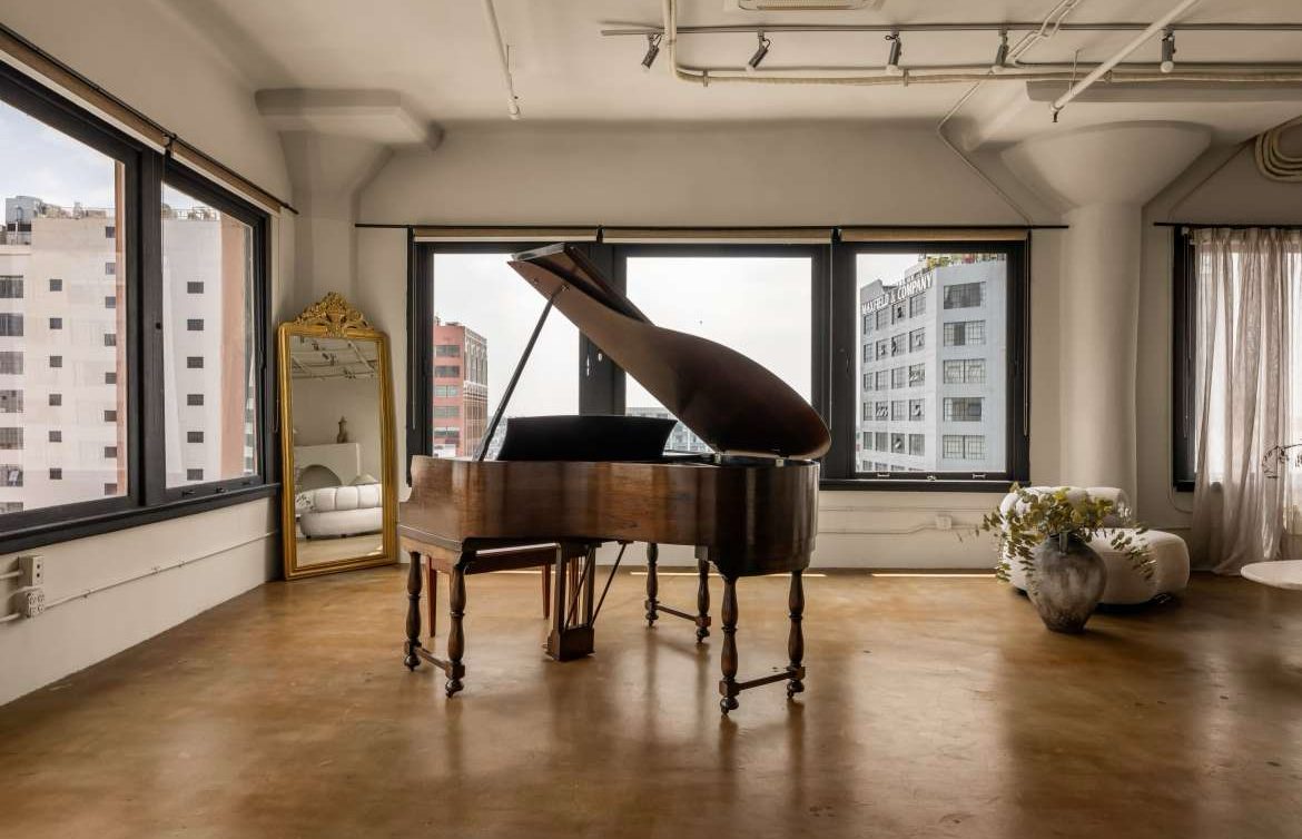 - Modern studio aesthetic with couches, a piano, and curated décor