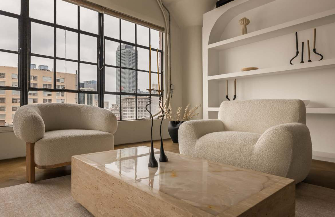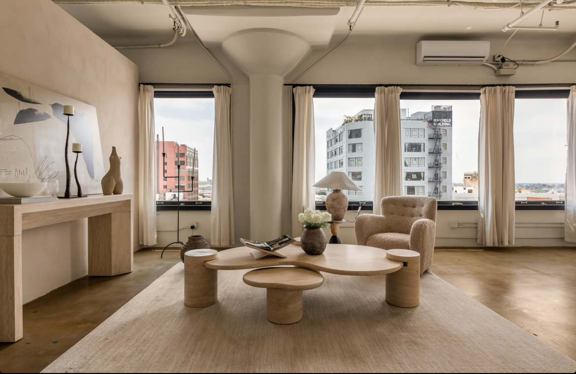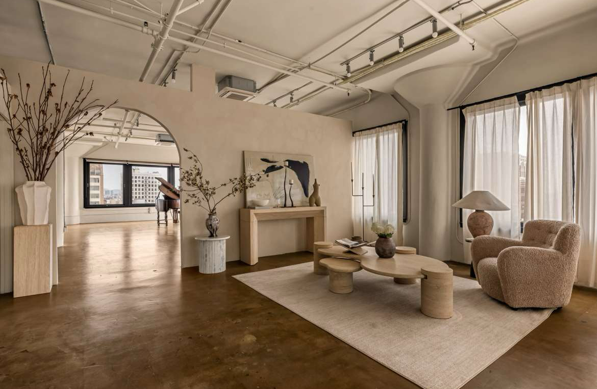 - Modern studio aesthetic with couches, a piano, and curated décor